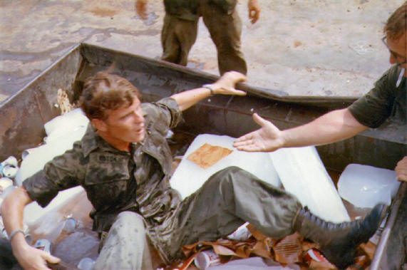 Chuck Eaton being dunked in the beer trailer after promotion to tech inspector (TI). That's Cpt Linstrom offering a hand. "Courtesy of Chuck Eaton" | ||||